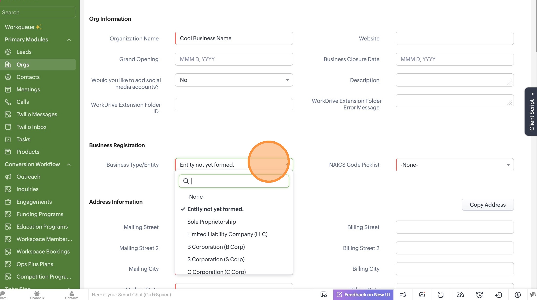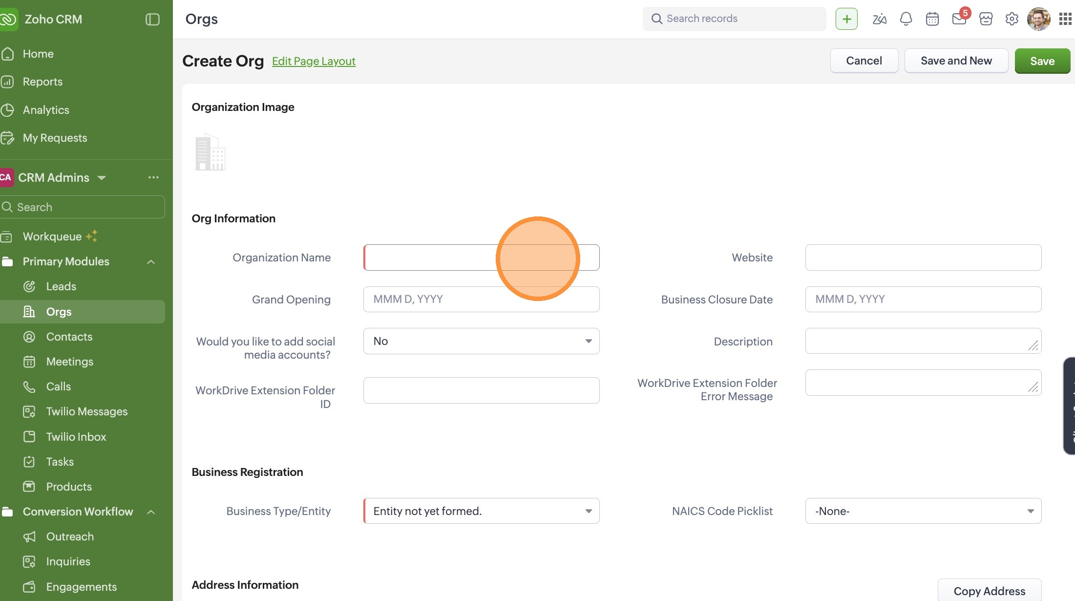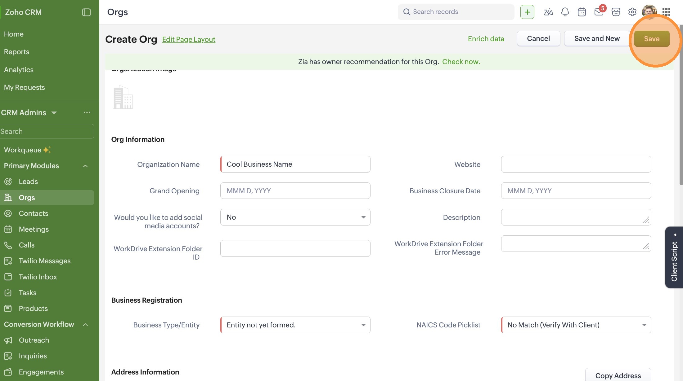 Create a New Organization in Zoho CRM