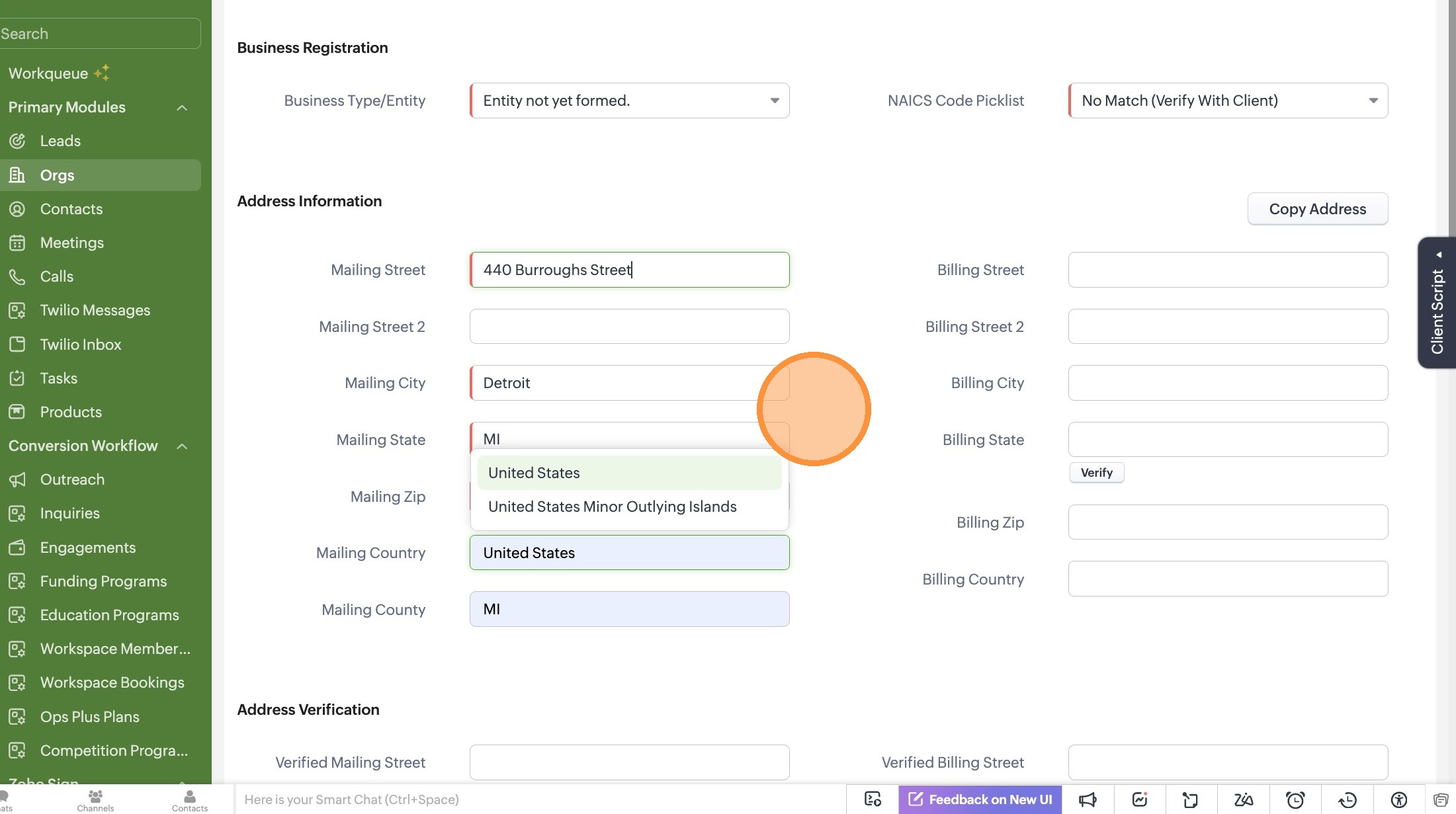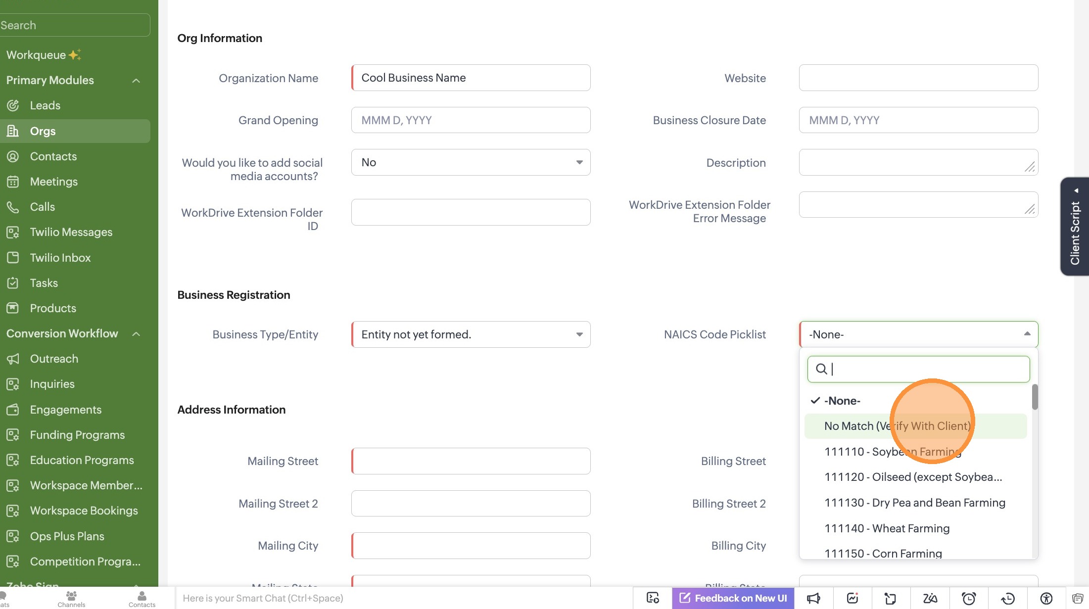 6. Search for an NAICS code by number or keyword. If you don't know which NAICS code to choose, select "No Match (Verify With Client)"